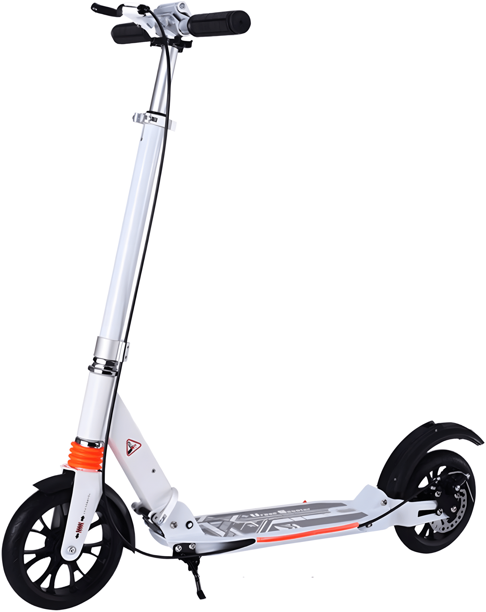 مصنوع من ألومنيوم قوي جداً، يعني هتضمن متانة ووزن خفيف في نفس الوقت. الكاوتش كبير (200 مم) ومصنوع من PU، فهتحس براحة أكتر أثناء السواقة واهتزاز أقل.